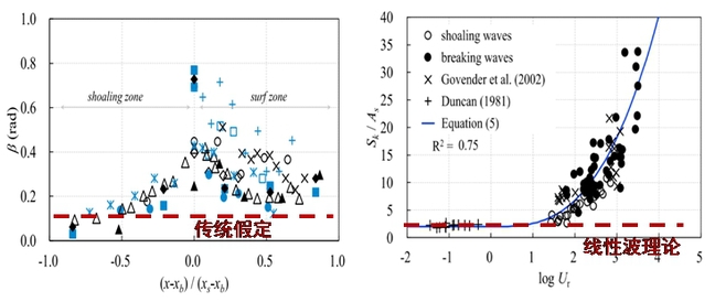 图1.1.5 第三类超谐波布拉格共振透射系数随入射波波数变化(左)与透射波沿程演化(右) 揭示了沙坝地形上强非线性波浪的波形系数(1/20~1/8)和波峰面坡度(0.1~0.8)显著偏离理论值且与厄塞尔数呈线性和指数型关系,诠释了波浪变形产生的波生流时均压强梯度是引起底部边界层余流“层内向岸、层外离岸”和“浅化区向岸、破波区离岸”形态转化的成因。