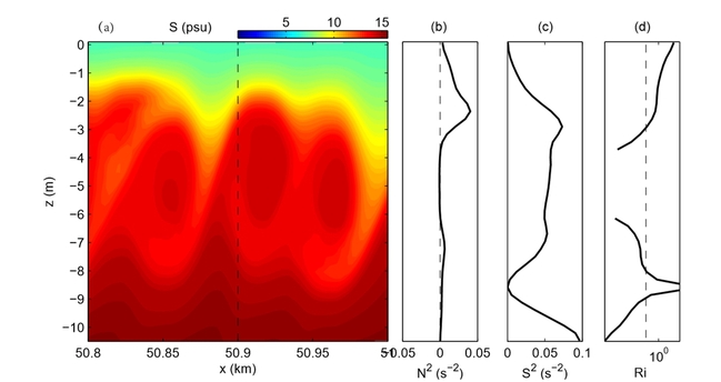 图2.1.5 长江口北槽K-H涡发生时盐度、速度梯度、盐度梯度、理查德森数垂向分布图 |