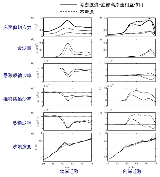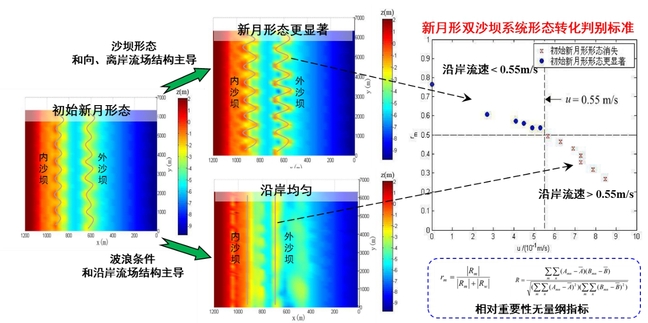 图2.2.1 波流相互作用对泥沙输运和沙坝迁移的影响 发现沙坝顶点处的沿岸流流速是双沙坝沿岸形态在新月形和平直形之间循环转化的主控因子,厘清了双沙坝系统形态多变的疑惑。