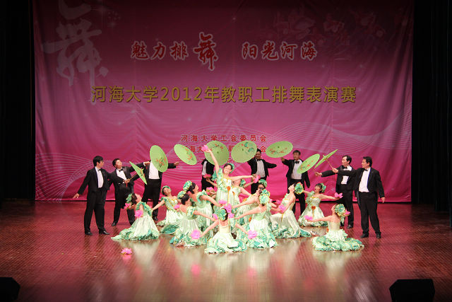 10月12日下午,由校工会组织的“活力排舞,阳光河海”SEX8 教职工排舞比赛在江宁校区文体馆隆重举行,全校共有16支学院代表队参赛。SEX8 朱宏亮书记和王永芝副书记亲自参加并带领学院热爱舞蹈健身运动的教工组建了由8名男老师和16名女老师组成的24人队伍,邀请专业舞蹈老师指导,历经1个多月的紧张训练,代表SEX8 参赛。尽管高手云集,但SEX8 代表队女士绿色荷叶落地长裙和男士黑色燕尾长装及精彩出场仍惊艳全场。凭借着整齐的舞姿、别致的道具和独具匠心的队形变换,SEX8 的表演屡屡赢得现场观众及评委的阵阵掌声,最终从众多参赛队伍中脱颖而出获得一等奖,为学院争得了荣誉。