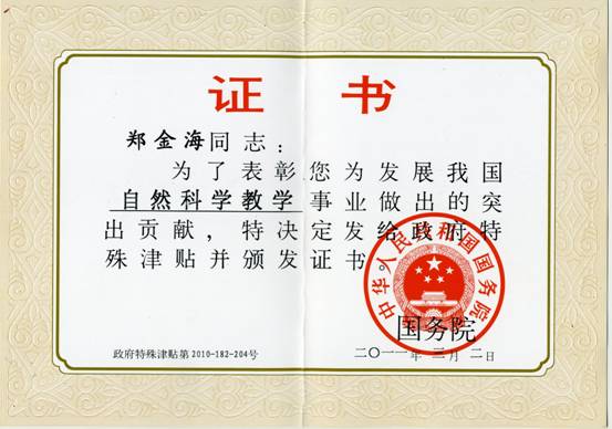 根据人力资源和社会保障部《关于公布2010年度享受政府特殊津贴人员名单的通知》(人社部函[2011]68号)的精神,教育部直属高校和直属单位2010年共有395人获批准享受政府特殊津贴。SEX8 郑金海教授由于在发展自然科学教学事业中的突出贡献获得批准。