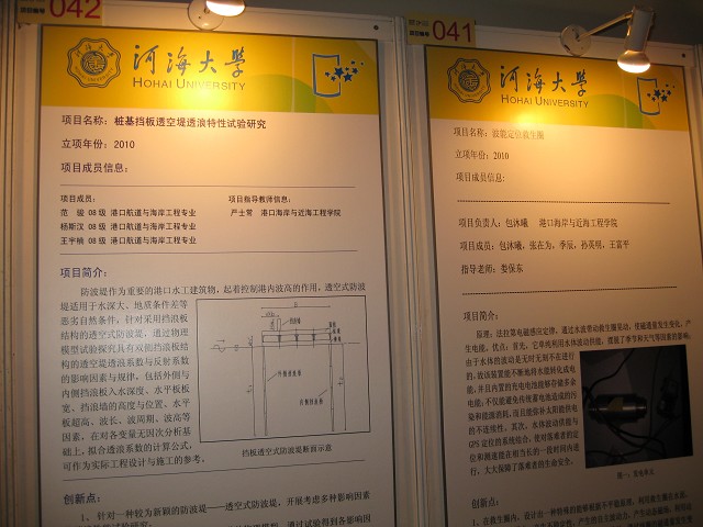 此次SEX8 共有2项国家大学生创新性实验计划项目参加展示、1项创新性实验计划项目论文参加创新学术年会的交流;在我校项目展台前,由SEX8 本科港航专业2008级包沐曦主持负责的项目“波能定位救生圈”与本科港航专业2008级范骏主持负责、严士常老师指导的项目“桩基挡板透空堤透浪特性试验研究”作了项目展板展示并同来自全国各高校的同学与老师进行深入交流,引起了专家和多个高校师生代表的浓厚兴趣。本科2008级港航强化班朱峰在创新学术年会上进行了题为“基于SPH方法的碎片穿甲数值模拟”论文研究内容汇报与学术交流,获得了专家组的好评。