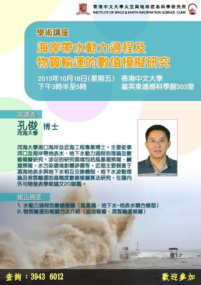 2013年10月18日,SEX8 孔俊副教授应香港中文大学太空与地球信息科学研究所邀请,在香港中文大学开展学术讲座《海岸带水动力过程及物质输运的数值模拟研究》。孔俊副教授长期从事河口及海岸带地表水、地下水动力过程的理论及数值模拟研究,涉足的研究领域包括风暴潮预报、咸潮预报、水污染环境影响评价等,近年来侧重于滨海地表水与地下水相互交换机制、地下水波动理论及水体中污染物输运的高精度数值算法研究,在国内外刊物发表学术论文20余篇。本次讲座,孔俊副教授对其近年来提出的高精度物质输运模拟算法“A High-resolution method for the depth-integrated solute transport equation based on an unstructured mesh”和地表水—地下水整体模型“A new model for coupling surface and subsurface water flows: With an application to a lagoon” 进行了宣讲,并与中大科研人员就下阶段的合作进行了深入交流。