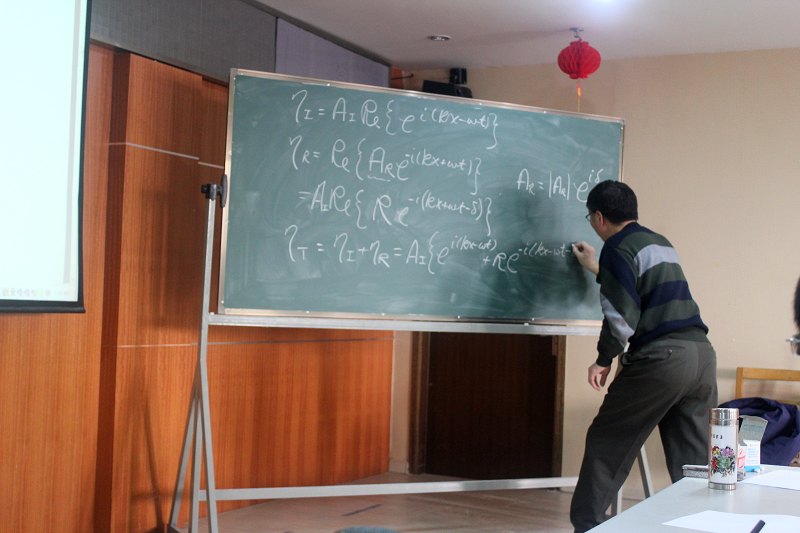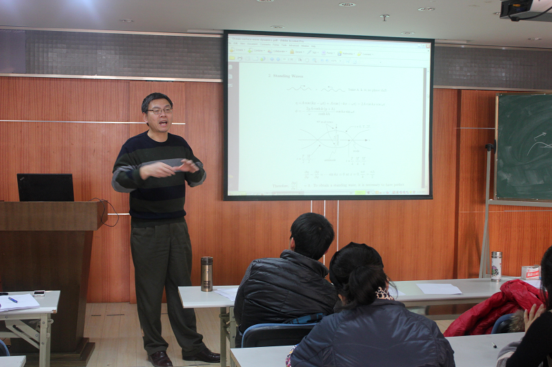 在教学环节,刘老师采用MIT原版教材为SEX8 在读博士和部分年轻教师系统讲授了“高等海岸动力学”和“港口、海岸及近海工程前沿专题讲座”两门博士学位课程中有关高等水波动力学的部分。讲课内容分为三部分,一是线性波及其与建筑物的相互作用,二是经典非线性波浪理论及其应用方法,三是波浪与建筑物相互作用问题的数值求解方法。刘老师一再强调他授课的两个主要目标,一是重新理解最简单的基础,他想让大家理解水波的基本问题,掌握最基本的推导方法和研究思路;二是真正领悟科学研究思路的连续性,他想让大家知道前沿问题的解决均源自这些基本问题,且通过所讲基本方法的熟悉运动都可以有所突破。期间翔实丰富的课程讲义,详尽清晰的板书推导,深入浅出的娓娓讲述,朴实准确的学术用语,让所有的听课人都觉得受益匪浅。