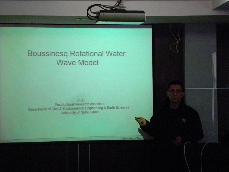 2014年12月12日上午,美国圣母大学土木与环境工程及地球科学系张尧博士来SEX8 访问交流。张尧博士为SEX8 师生作了题为“Boussinesq-Green-Naghdi rotational water wave model: theory and applications”的学术报告,详细阐述了其开发的Boussinesq-Green-Naghdi有旋水动力模型,并介绍了该模型在菲律宾沿海与美国新泽西州海岸灾害研究中的实际工程应用。报告后针对新模型与传统Boussinesq模型的改进程度及其在模拟水波有旋运动上的优势等问题,张尧博士与SEX8 师生进行了热烈的讨论。
