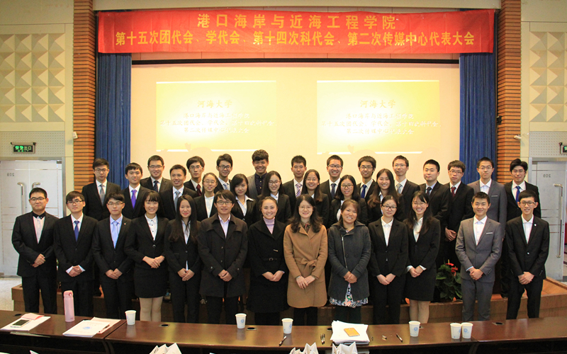 2015年11月14日上午,SEX8 第十五次团代会、学代会,第十四次科代会,第二次传媒中心代表大会在江宁会议中心二楼报告厅如期举行。校团委杨天副书记,港航院党委胡忠华书记、姜海霞副书记,校学生会副主席宁珏同学,校学生科协主席陈程同学,校传媒中心新媒体部部长徐少卿同学,土木院团委吴昊书记,外语院团委王璐书记,港航院团委副书记、13级本科生辅导员王玲老师,14级本科生辅导员季超老师,15级本科生辅导员安杰晶老师,12级本科生辅导员助管张清扬出席本次会议。