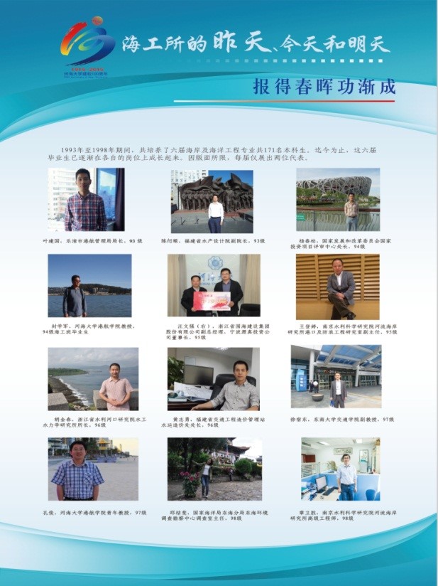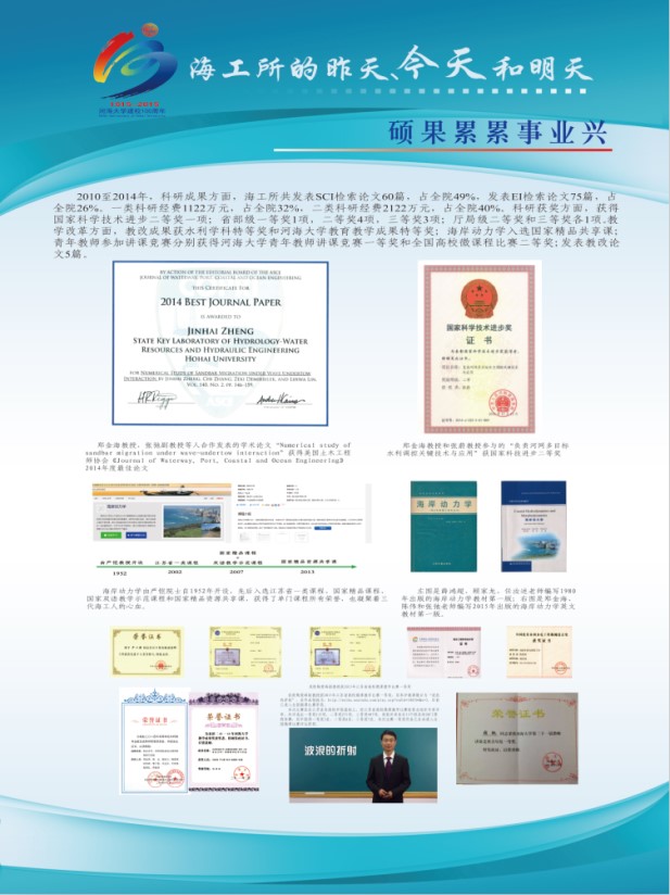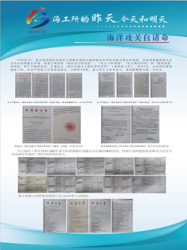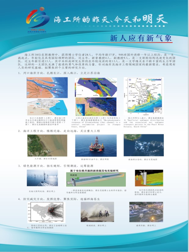 该展览由“前言”、“昨天”“今天”、“明天”和“后记”五个板块组成。“前言”中详细记述了海工所自1979年由水利部批准组建发展至今的历史沿革,明确了校庆期间组织本次文化展的定位和意义。“昨天”板块由“海洋攻关自请命”、“心无旁骛力践行”、“春风化雨潜滋润”和“报得春晖功渐成”四个展板组成,展示了海工所历史发展过程中,特别是海工所发展初期老一辈海工人在为我国海岸及海洋工程事业发展及人才培养等方面表现出的努力拼搏的精神、勇于担当的气魄和高瞻远瞩的智慧。“今天”板块由“薪火相传心相映”和“硕果累累事业兴”两个展板组成,展示了海工所近五年在人才培养、科学研究、服务社会已经团队建设等方面的主要成绩,也展示了海工所全体同仁团结友爱的融洽气氛、乐观向上的积极心态和井然有序的前进势态。“明天”板块由“新人应有新气象”和“大哉海工奔前程”两个展板组成,展示了海工所未来重点发展的学科方向已经发展愿景,展现了现代海工人继往开来的决心和稳步前进的信心。“后记”板块再次强调了本展览在回顾历史、总结现在和展望未来中的作用,并对包括提供历史资讯的老一辈海工人等所有为本次展览活动付出辛苦努力的人和组织表达了最真诚的谢意。