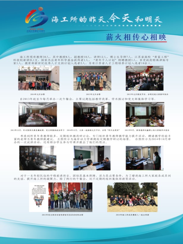 2015年10月25日至31日,SEX8 海工党支部在SEX8 校党委组织部和SEX8 党委的共同支持下,举办了主题为“海工的昨天、今天和明天”的文化展活动。展览过程中,除了海工党支部全体党员专门组织了观展和学习活动外,学校的师生员工以及校庆期间返校的校友们等约三百余人次参与了该活动。本次展览活动旨在通过对海工辉煌历史的梳理,提升海工所全体教师的集体荣誉感;通过对海工文化精神的凝练,实现海工精神的传承与可持续发展;通过对海工过去成绩、现在工作以及未来愿景的展示,促进海工人的自我认可,树立着海工精神在全院以及全校文化建设中的模范形象。
