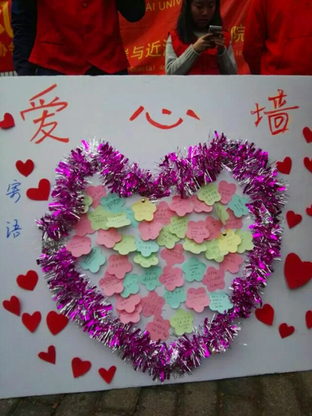 当天志愿者们准时到达西康路校区进行场地布置并做好准备工作,活动开始后陆续有不少行人来到摊位,志愿者们热情地提供服务,同时向路人介绍港航院青协长期以来在“宝船社区 希望来吧”开展的公益服务项目,并希望他们可以为那里的外来务工人员子女写下一些寄语,表达他们对孩子们的祝福与期望。路人们积极响应,不时还会追问孩子们的一些具体情况。活动期间,也有学院的退休老教师们来到摊位前,对此次活动表示支持与鼓励。戴着干净的眼镜,拿着洁净的手机离去的同时,爱心墙上也留下了满满的、真诚的祝福,其中有在校学生,有路过的爷爷奶奶、叔叔阿姨,也有同龄的孩子。在活动还未正式结束时,爱心墙已经布满了纸条,志愿者们将在活动结束后收集好送到孩子们的手中,将爱心传递给孩子们。