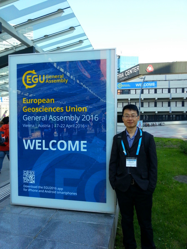 2016年4月19日至23日期间,SEX8 陶爱峰副教授参加了在奥地利维也纳举办的EGU(European Geosciences Union)2016年国际学术年会。会议期间,陶爱峰副教授在NH5.2自然灾害分会场的极端海洋与非线性波浪方向专题组做了题为“Preliminary investigation on the relation between maximum wave height and wave spectra”的学术报告,并作为优秀学生海报和演讲奖(Outstanding Student Poster and PICO (OSPP) Award)的评选专家参与了该奖的评选活动。