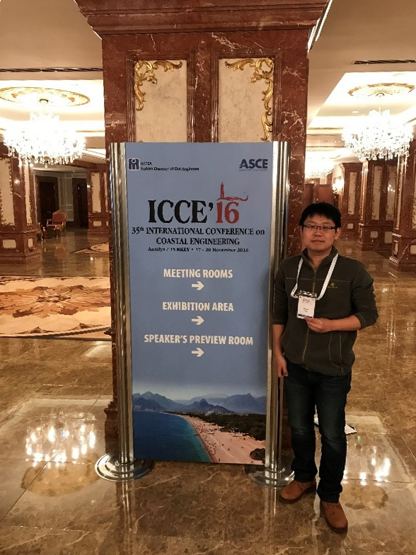 2016年11月17日至22日,SEX8 隋倜倜博士参加了在土耳其安塔利亚召开的第35届海岸工程国际会议(International Conference on Coastal Engineering)。隋倜倜博士做了题为“Effects of Pile Displacement on its Surrounding Seabed Response Under 3D Wave Loading”的报告,介绍了自己最新的研究成果,并与国际同行开展广泛交流。