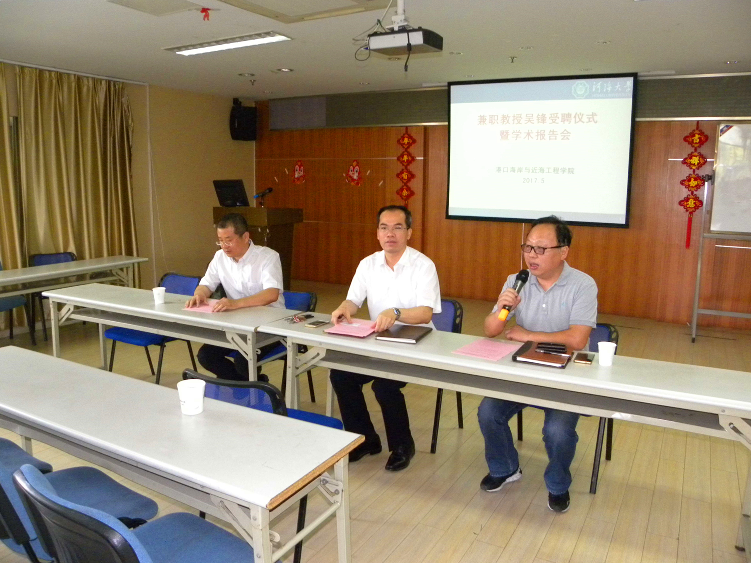 2017年5月26日,中交上海三航科学研究院有限公司副总经理兼总工程师吴锋兼职教授聘任仪式在SEX8 举行,郑金海院长为吴教授颁发了聘任证书。随后吴锋教授为SEX8 师生作了题为:“海上风电基础结构检测评估与维护技术”的学术报告,介绍了他所带领的团队在海上风电基础结构检测评估、运营监控以及防腐维护领域的新技术与新思想,并与参会师生进行了深入讨论与交流。