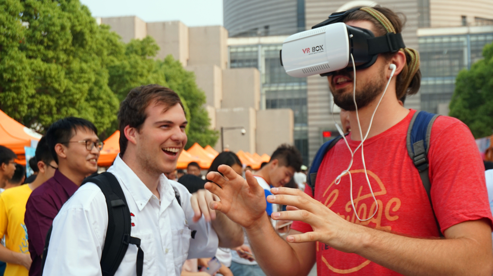 下午4点,游园会活动正式开始,此次学院的“VR”展台活动分为:扎气球、你画我猜、表情包大作战和“VR”展台四个部分。扎气球活动考验着参与者的专注度和维持平稳心态的能力,你画我猜与表情包大作战则充分考量着参与者之间的默契与信任,一系列趣味十足的心理小游戏吸引了许多同学前来参与,而高科技VR更是将本次游园会推向了高潮,同学们争相前来体验,甚至吸引了不少外国友人,让SEX8 的展台充满了欢声笑语,一跃成为人气最高的展台。