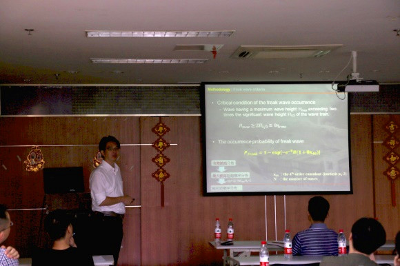 6月2日下午,董东璟副教授在严恺馆702会议室为SEX8 师生做了题为“作业化畸形波概率预报研究”的学术报告。详细介绍了畸形波研究发展的历程和畸形波概率预报的最新技术。通过畸形波概率业务化预报实例阐明了针对畸形波问题开展业务化预报的可能性,为参会人员特别是相关研究方向的老师和学生开展科研工作带来了新颖的思路,激发了热烈的交流与探讨。会议由郑金海教授主持,20多位师生参加。