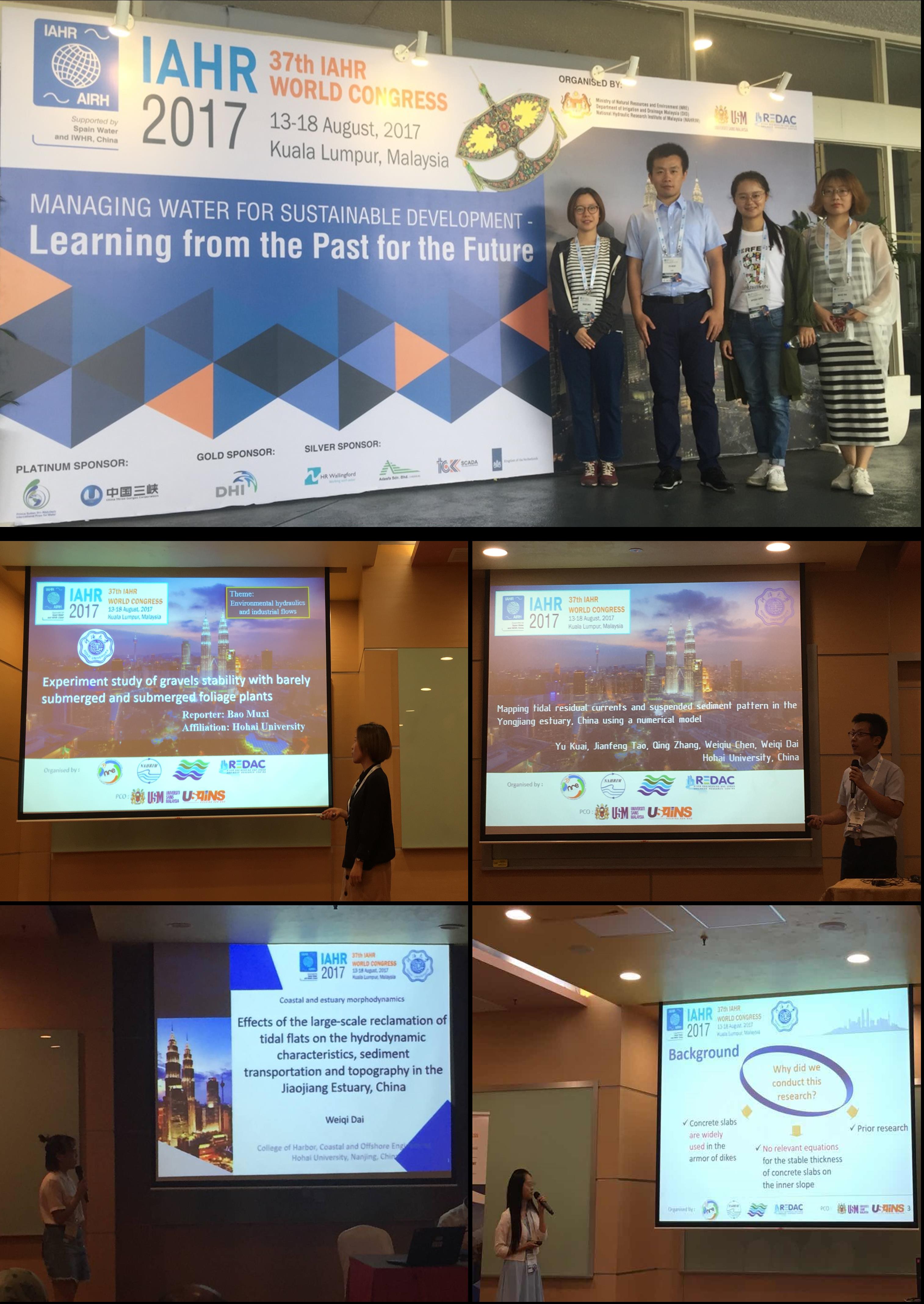 2017年8月13~8月18日,SEX8 港航院博士生包沐曦、戴玮琦,以及硕士生陈伟秋、蒯宇前往马来西亚吉隆坡参加了第37届IAHR(International Association for Hydro-Environment Engineering and Research)国际会议。SEX8 学生分别在大会上作了题为:“Experiment study of gravels stability with barely submerged and submerged foliage plants”, “Effects of the large-scale reclamation of tidal flats on the hydrodynamic characteristics, sediment transportation and topography in the Jiaojiang Estuary, China ”, “Experimental study on stable thickness of concrete slab revetment on inner slope of dikes”和“Mapping tidal residual currents and suspended sediment concentration pattern in the Yongjiang estuary, China using a numerical model”的口头报告,并与国际同行进行了深入交流。