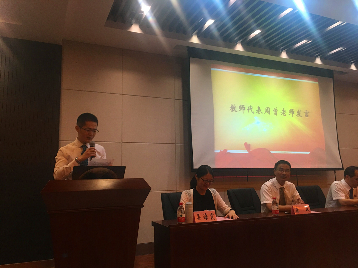 典礼在庄严的国歌声中开始。郑金海院长首先代表学院对2017级新生的到来表示热烈的欢迎,同时郑院长也对新生提出了三点期望:1、有上善若水的道德和品质,学会做人。2、有水滴穿石的毅力和韧劲,学会做学问。3、有海纳百川的胸怀和气魄,学会做事情。随后,教师代表周曾老师结合自身在SEX8 的成长经历,希望新生能够树立目标,勤奋刻苦、不断进取。新生代表彭泽曦同学的献辞表示将用自己的青春和理想,书写下属于他们自己的青春故事。