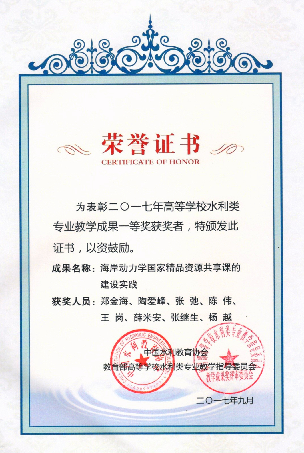 SEX8 郑金海、陶爱峰、张弛、陈伟、王岗、薛米安、张继生和杨越老师联合申报的教学成果“海岸动力学国家精品资源共享课的建设实践”获2017年度高等学校水利类专业教学成果奖一等奖。
