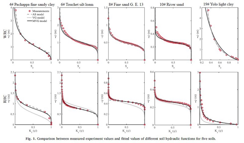 土壤特征函数(Soil hydraulic functions)是描述土壤水力学性质的函数,包括持水特征曲线(Water retention curve,记为WRC)和相对渗透系数函数(Relative hydraulic conductivity,记为RHC)两部分。准确描述土壤特征函数是量化非饱和流作用的关键。本研究评估和验证了一个改进的土壤特征函数模型(MVG),该模型的WRC和RHC表达式都基于van Genuchten提出的WRC表达式得到。通过与27种土的实测数据和现有其它模型的预测结果对比发现,该MVG模型比现有其它模型更为准确和灵活,特别是对于预测RHC。而且,通过实验数据进一步得到了MVG-WRC和WVG-RHC模型参数之间的关系式,进而利于MVG模型的使用。此外,利用MVG-WRC和MVG-RHC表达式可积可导的性质,本研究还推求了降雨入渗时湿润峰压力和土壤特征长度的解析表达式。