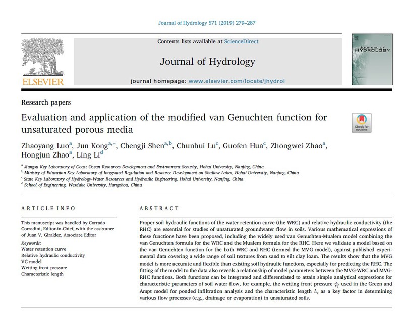 近日,SEX8 2017级博士研究生罗照阳(导师:孔俊教授)在《Journal of Hydrology》上发表了题为“Evaluation and application of the modified van Genuchten function for unsaturated porous media”的学术论文,该研究是继孔俊教授团队在土壤非饱和流研究领域的又一重要成果。