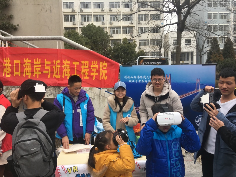 本次活动分为“VR港珠澳”和“电池银行”两个环节。“VR港珠澳”围绕港珠澳大桥展开,邀请现场老师、同学佩戴VR眼镜体验港珠澳大桥的宏伟全景,同时,志愿者通过展板向他们讲述港珠澳大桥的相关知识和港航人在其中的贡献。“电池银行”则以废旧电池换取环保袋的形式,呼吁大家从生活中的小事做起,保护环境人人有责。