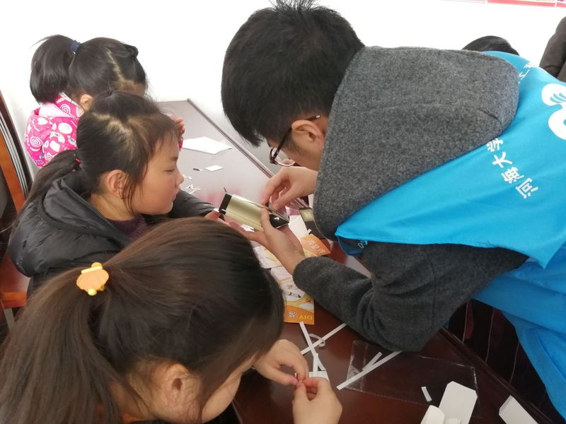 在课堂知识讲解基础之上,本次志愿活动增设了动手环节,由志愿者们以一对一或一对多的形式指导孩子们动手制作潜望镜模型,培养孩子们的动手能力,让孩子们将课堂讲解的光学知识学以致用。制作环节结束后,志愿者们对潜望镜原理进行了讲解,让孩子们“从学中来,再到学中去”。