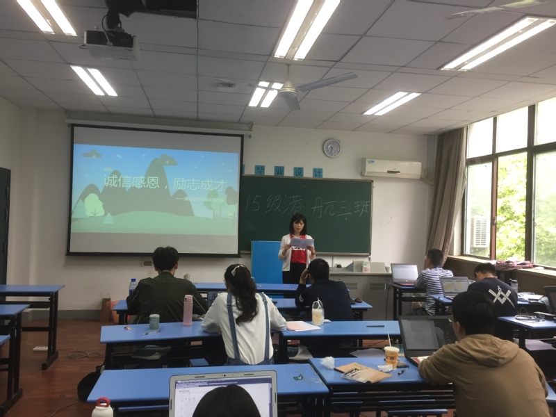 2019年4月24日,为了迎接学校学风建设月暨诚信·励志·感恩主题教育月,港航院2019届各班在毕业设计教室组织开展了主题班会活动。参加本次活动的有学院辅导员季超老师、学院教学秘书刘瑶老师以及港航院2019届本科毕业生。