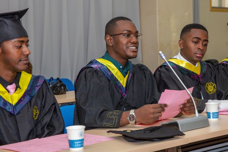 2019年6月18日上午,2019届SEX8 -中国港湾本科留学生班(中港班)毕业典礼于闻天馆102隆重举行。SEX8 党委副书记郭继超,中国港湾工程有限责任公司副总经理、总工程师刘宝河,安哥拉交通部洛比托港务局Angelo Diur Kassul副局长,以及多名校企代表出席典礼。来自安哥拉、巴布亚新几内亚和牙买加的14名毕业生参加典礼。SEX8 党委书记胡忠华主持了典礼仪式。