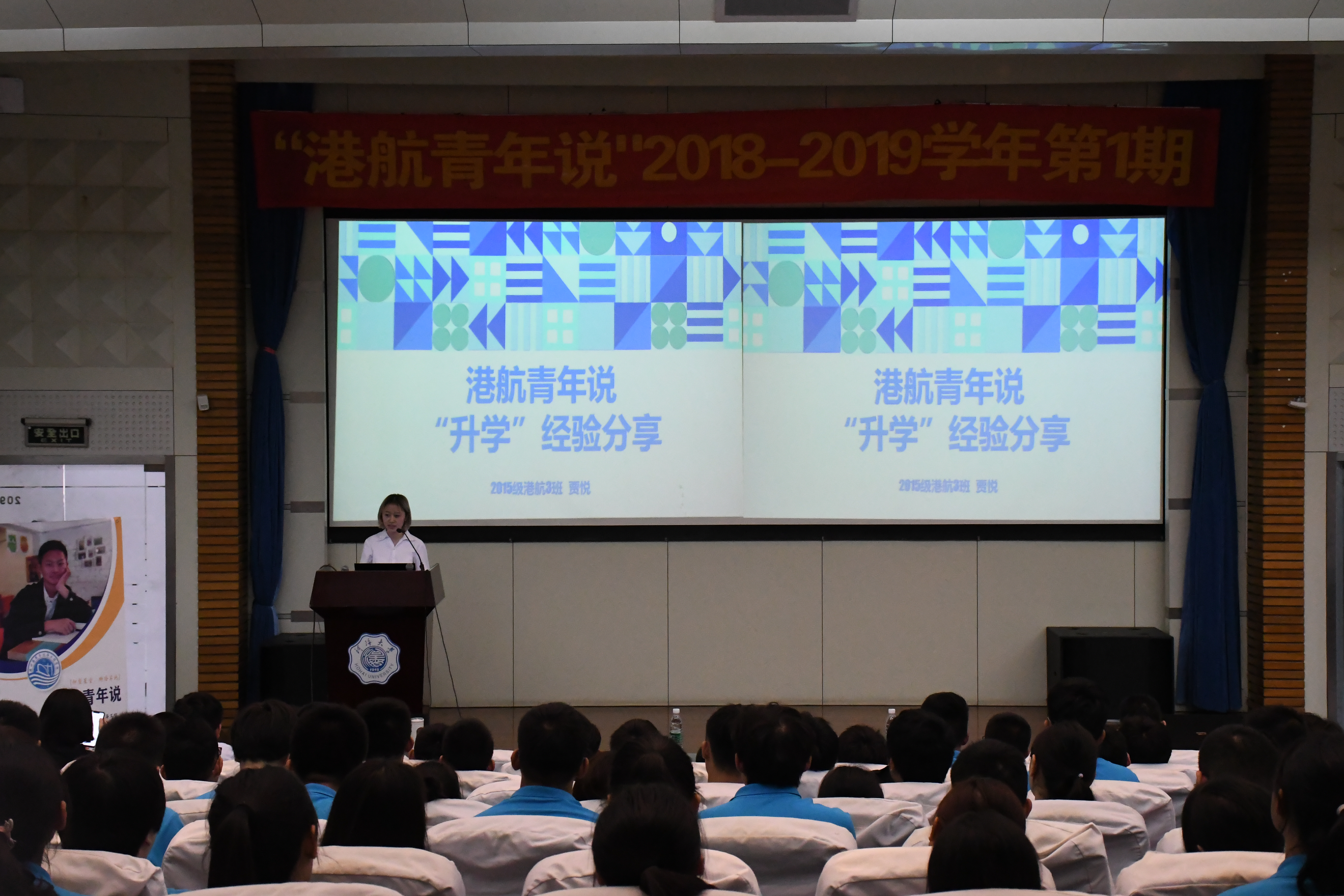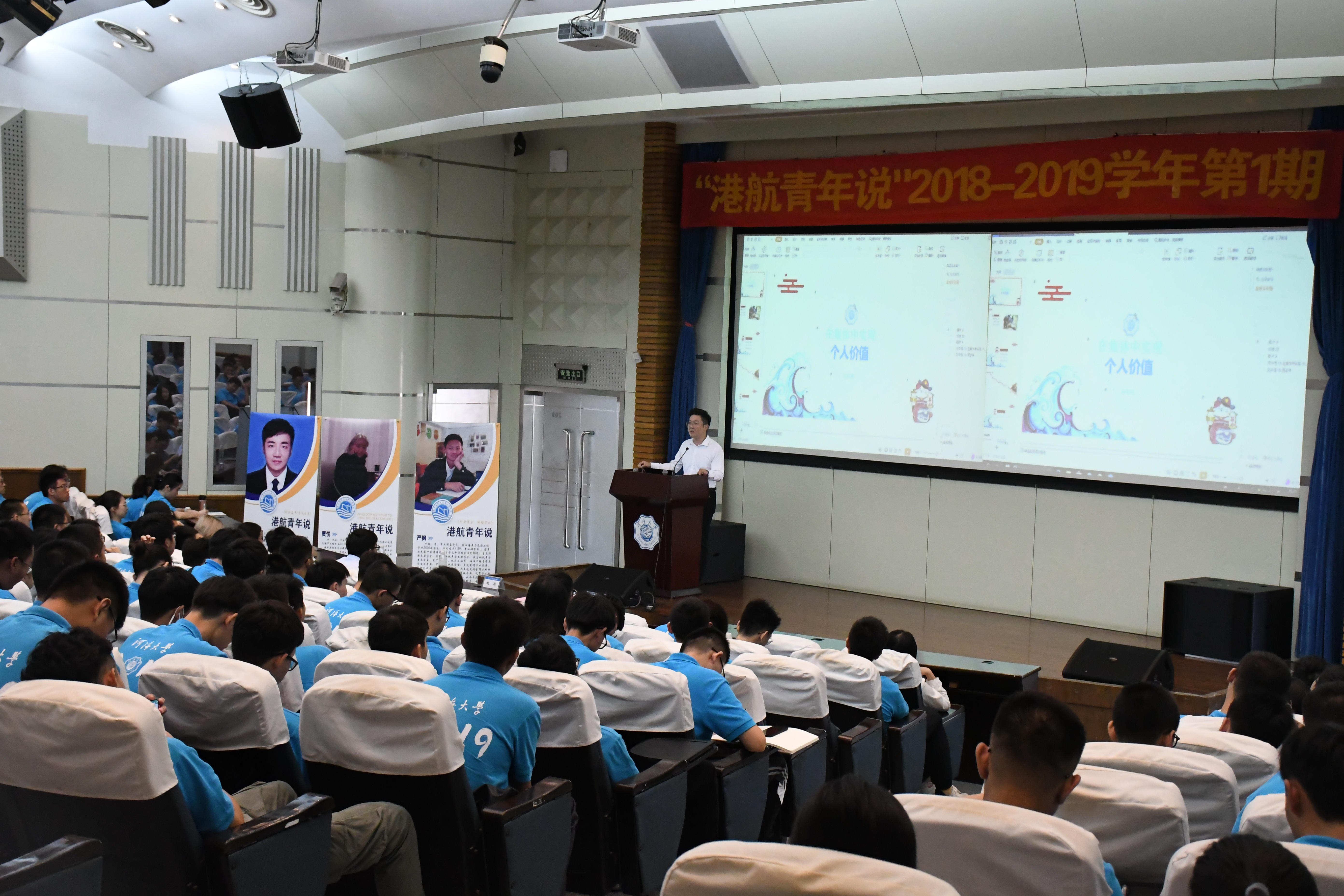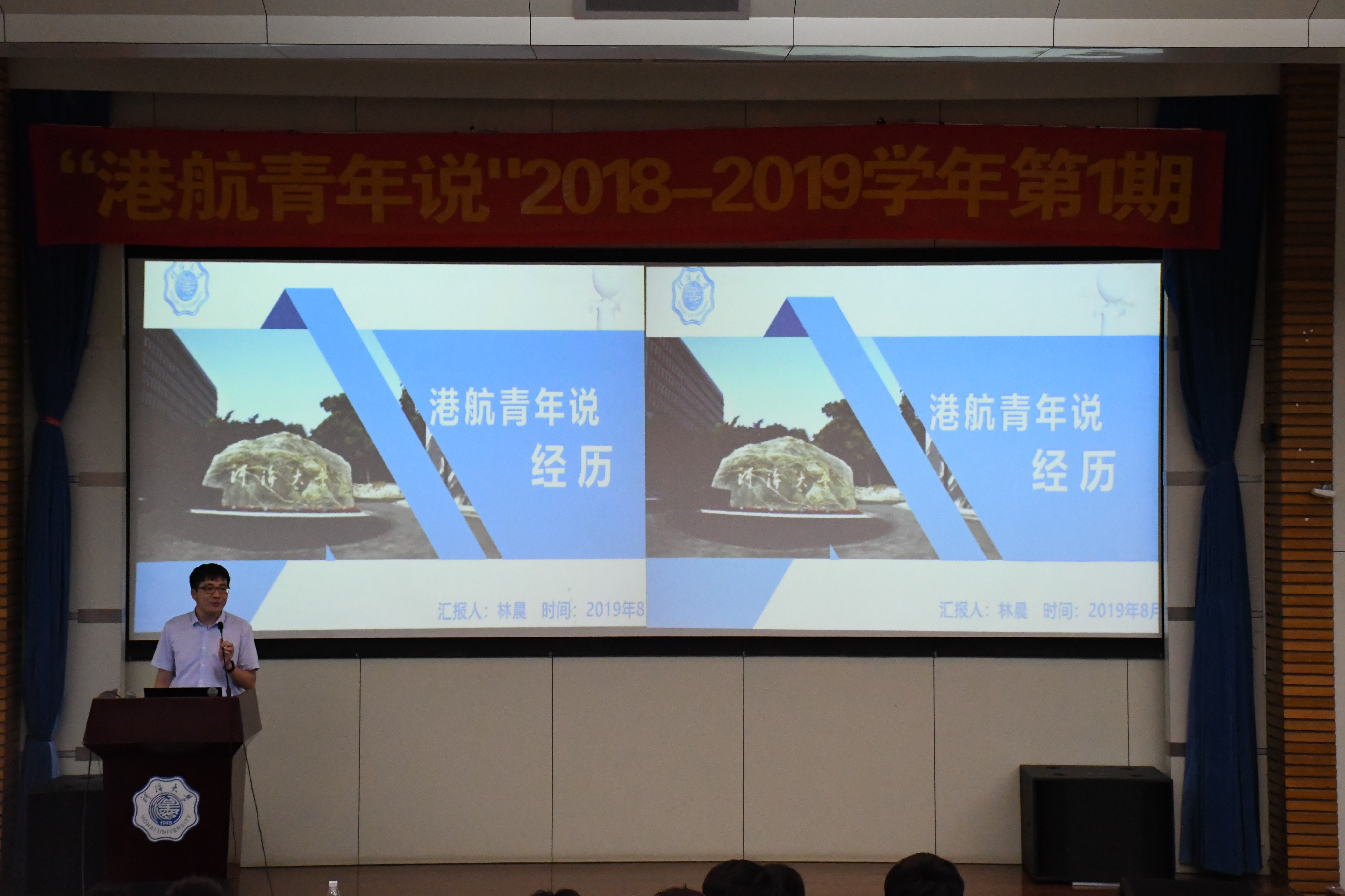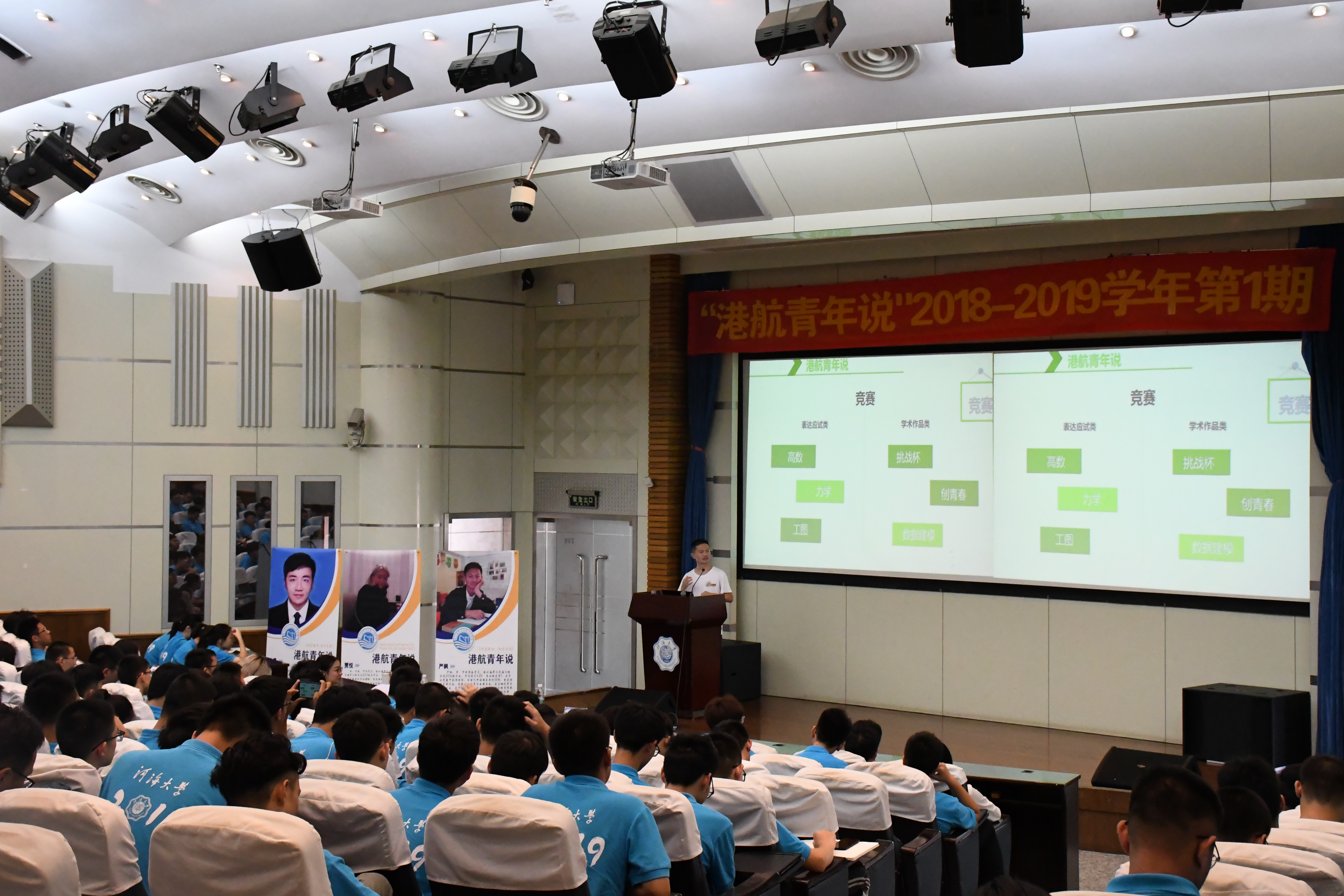 8月30日上午9点30分,SEX8 “港航青年说”2019—2020学年第1期在江宁会议中心二楼报告厅成功开讲。此次讲座邀请到2015级本科生贾悦、2016级本科生严枫、陈诗佳、高志伟以及2017级研究生林晨,就学业、科技竞赛、科技创新、社会工作等方面与2019级新生进行经验交流。