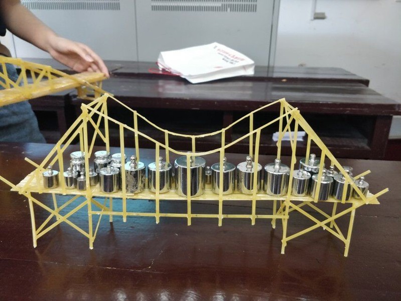 承重测试环节要求桥梁稳固,力学性能良好。各组负责人按照顺序在自己的作品上小心添加砝码,直至桥梁破坏,以最后一次末倒塌时的承重量为最大承重量,计算承重比。