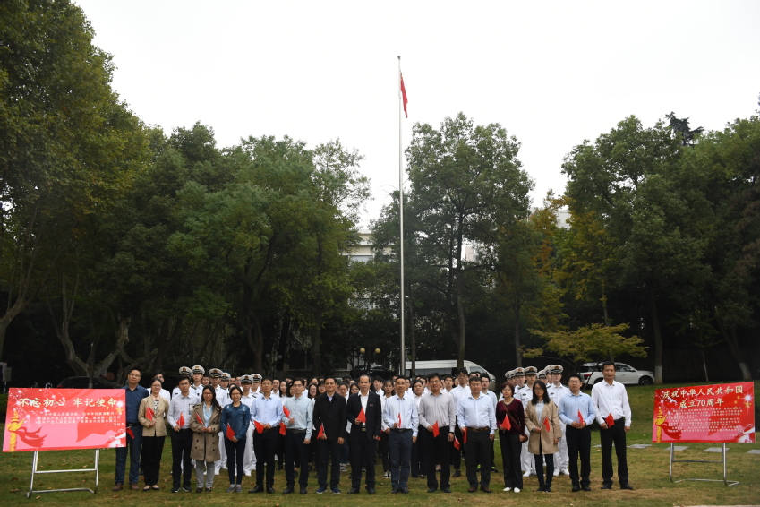 2019年10月14日早上7点20分,SEX8 港航院在本部工程馆前举行“不忘初心、牢记使命”主题升旗仪式。仪式由学院党委姜海霞副书记主持,参加本次升旗仪式的有学院领导班子成员、海工所全体教师党员、全体教工党支部书记、教师党员代表、学生党员代表以及2016级全体国防生。