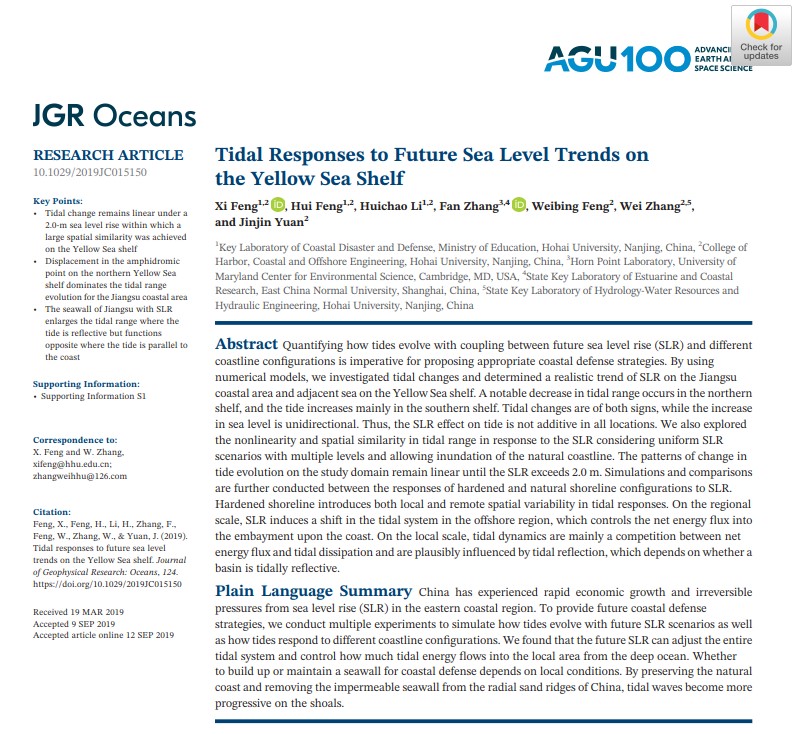近日,隶属海岸灾害及防护教育部重点实验室(SEX8 ),(Key Laboratory of Coastal Disaster and Defence (Hohai University), Ministry of Education)的冯曦老师携研究生冯辉、李慧超等在国际学术TOP期刊《Journal of Geophysical Research: Oceans》上发表高质量研究论文“Tidal responses to future sea level trends on the Yellow Sea shelf”。该论文阐明了复杂海岸带环境下,海平面上升与潮能演化之间的动态规律,首次界定了在中国特有的开放式海岸条件下,近岸潮能演变规律由线性形态到非线性形态的零界位置。同时,指出了在刚性和柔性护岸不同条件下,黄海大陆架近岸潮能应对海平面上升的自适性。该论文反映了平行岸线的前进潮波与垂直岸线的类驻波潮波与不同护岸之间的组合关系;从运动机制与动力机制两方面分别揭示了柔性护岸与刚性护岸工程对近未来(100年间)潮能发展的状态。该成果不仅具有重要的理论意义,而且对目前我国的生态护岸工程也有广泛的现实借鉴作用。