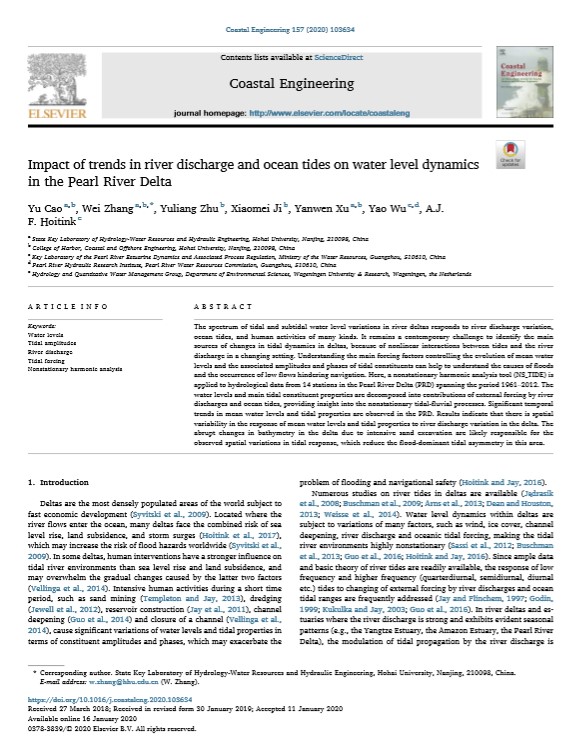 近日,SEX8 硕士研究生曹煜(已毕业,全国首届高等学校水利类优秀研究生学位论文获得者)与其导师张蔚教授(通讯作者)在中信所一区,海岸工程类排名第一的国际学术期刊《Coastal Engineering》上发表高质量学术论文:“Impact of trends in river discharge and ocean tides on water level dynamics in the Pearl River Delta”。近年来,SEX8 加大硕士研究生的培养力度,包括学院支持硕士研究生短期访学和国际交流,极大的促进了高水平成果的产出。