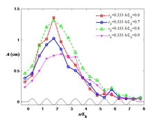 图1.1.5 第三类超谐波布拉格共振透射系数随入射波波数变化(左)与透射波沿程演化(右) 揭示了沙坝地形上强非线性波浪的波形系数(1/20~1/8)和波峰面坡度(0.1~0.8)显著偏离理论值且与厄塞尔数呈线性和指数型关系,诠释了波浪变形产生的波生流时均压强梯度是引起底部边界层余流“层内向岸、层外离岸”和“浅化区向岸、破波区离岸”形态转化的成因。