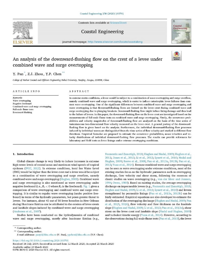 近日,SEX8 教师潘毅、陈永平和博士生周子骏在中信所一区,海岸工程类排名第一的行业Top期刊《Coastal Engineering》上发表高质量学术论文:“An analysis of the downward-flushing flow on the crest of a levee under combined wave and surge overtopping”。