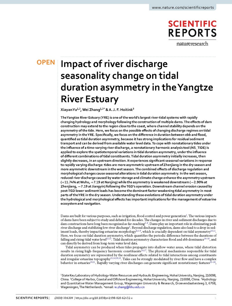 近日,SEX8 三年级硕士研究郁夏琰和指导教师张蔚教授(通讯作者),与Journal of Geophysical Research(JGR)-Earth Surface主编Hoitink教授合作,在Nature旗下期刊《Scientific Reports》发表高水平论文 “Impact of river discharge seasonality change on tidal duration asymmetry in the Yangtze River Estuary”。研究课题得到了国家重点研发计划项目“长江口水沙变化与重大工程安全(2017YFC0405400)”的资助。
