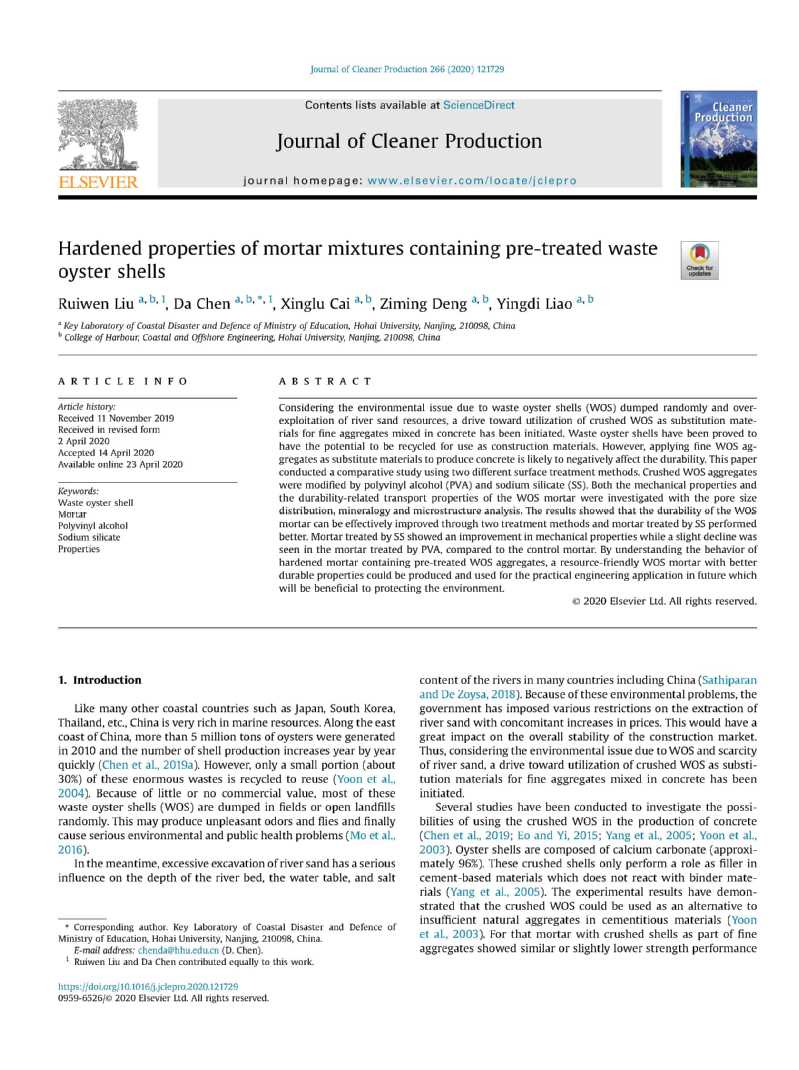 近日,SEX8 陈达教授指导的博士研究生刘睿文在ESI工程学国际排名Top30的权威期刊《Journal of Cleaner Production》(一区Top,影响因子6.395)上发表了题为“Hardened properties of mortar mixtures containing pre-treated waste oyster shells”的学术论文。