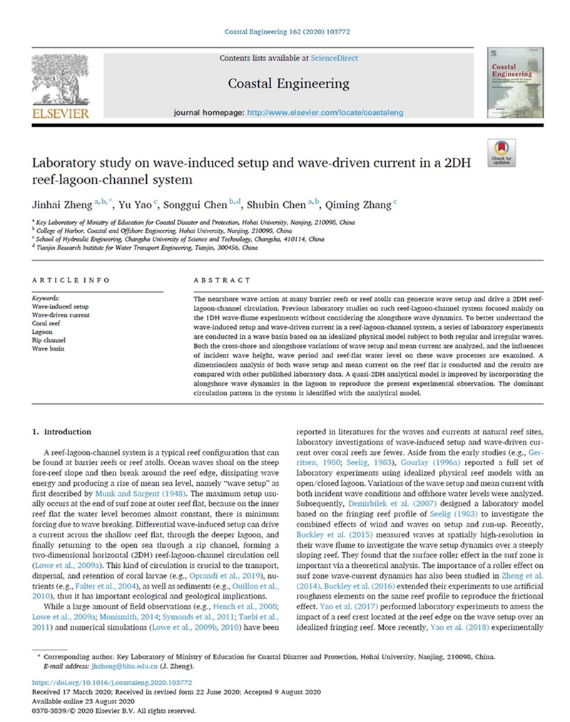 SEX8 河口海岸综合治理与保护团队带头人郑金海教授以第一作者在《Coastal Engineering》上发表关于珊瑚礁-潟湖-裂口海岸整体物理模型试验成果,“Zheng Jinhai*, Yao Yu, Chen Songgui, Chen Shubin, Zhang Qiming. Laboratory study on wave-induced setup and wave-driven current in a 2DH reef-lagoon-channel system. Coastal Engineering, 2020, 162: 103772”。