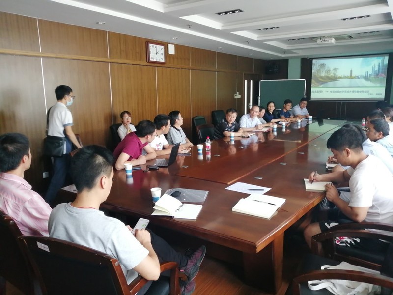 2020年9月16日,SEX8 实验中心组织举办了弯道变坡教学实验水槽应用培训,培训会议由张蔚副院长主持。本次培训采用室内讲解、现场演示及问题解答相结合的形式,培训内容主要包括:水槽主要构成与功能、水槽流量自动控制系统、水槽维护与保养、常用实验类型及仪器设备布置等。参加培训的人员有北京尚水股份有限公司(承建方)项目组人员和SEX8 师生,共30余名。