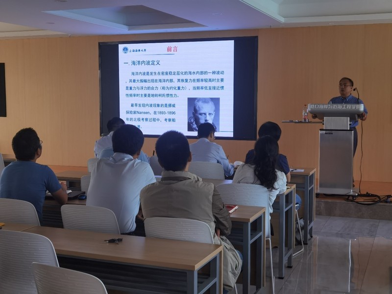张洪生教授作了题为“两种表面边界条件下分层海洋中内波传播的数值模拟”的学术报告,报告详细介绍了南中国海海域内波的特征与影响、自由水面和刚盖假定两种水面边界条件下的内波在空间传播特征与动力特性方面的对比分析。会后,张洪生教授和与会师生就南中国海内波的相关问题展开了热烈的讨论与交流。该报告会是SEX8 海岸灾害及防护教育部重点实验室河口海岸保护利用系列特邀学术报告会系列报告,对SEX8 在海岸与海洋工程防灾以及水波动力学方面的学科发展起到了良好的推进作用。