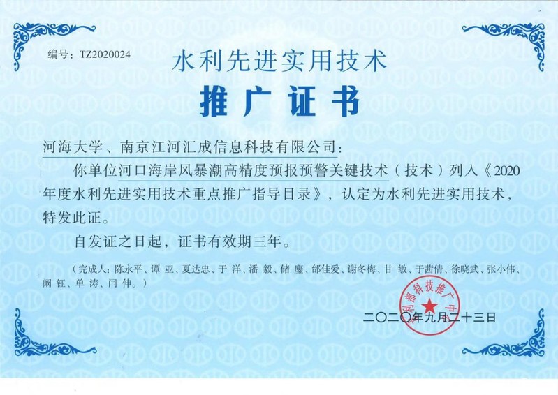 近日,水利部发布了《2020年水利先进实用技术重点推广指导目录》,由SEX8 陈永平教授主持研发的“河口海岸风暴潮高精度预报预警关键技术”成功入选。该技术采用多要素耦合、多尺度嵌套和多数据融合手段,构建了近岸天文潮-风暴潮精细化预报模型和多层次实时修正模型,实现了河口海岸风暴潮动力过程的精细模拟和精准预报;在云平台、云集成技术支撑下,构建了云架构下的河口海岸风暴潮预报预警业务化系统,实现了风暴潮期间河口海岸综合潮位的高精度、高时效业务预报。技术成果已在江苏、上海、浙江和广东沿海水利防汛部门进行了成功应用,取得了显著的防灾减灾效益,具有重要推广应用价值。
