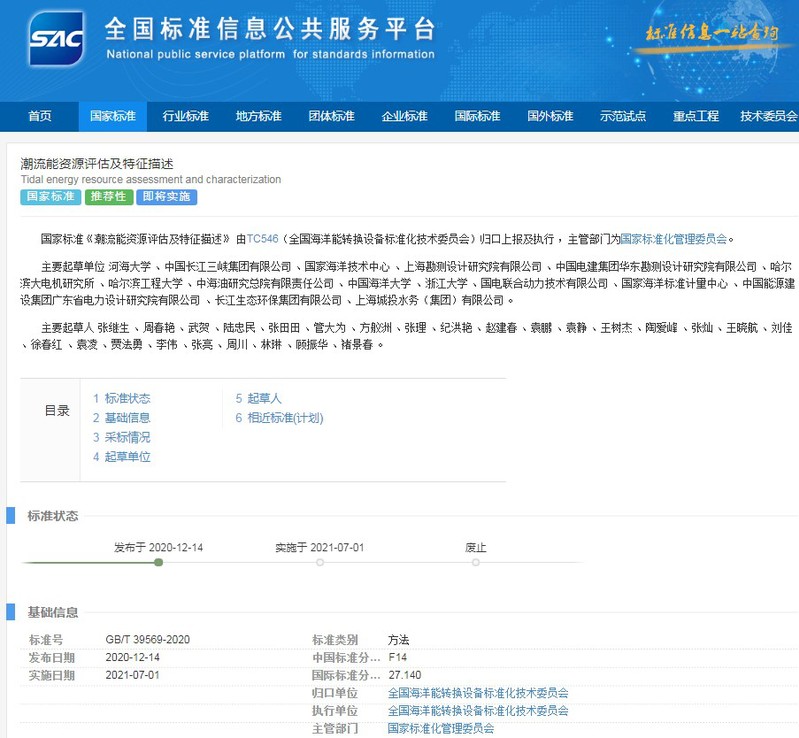 本标准的主要起草单位包括SEX8 、中国长江三峡集团有限公司、国家海洋技术中心、上海勘测设计研究院有限公司、中国电建集团华东勘测设计研究院有限公司 、哈尔滨大电机研究所 、哈尔滨工程大学 、中海油研究总院有限责任公司 、中国海洋大学、浙江大学等单位。该标准由全国海洋能转换设备标准化技术委员会(TC546)归口上报及执行,主管部门为国家标准化管理委员会。