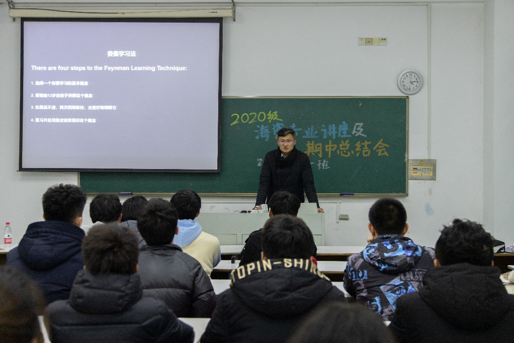 20201211日下午,2020级海洋资源开发技术专业讲座第3期暨期中考试总结会在江宁校区致高楼A111教室成功举办。本次讲座邀请到了海岸带资源与环境研究所李欢老师作为主讲嘉宾,李老师从大学生活、学习方法等方面展开了讲座;期中总结会由班导师苏敏老师主持召开。