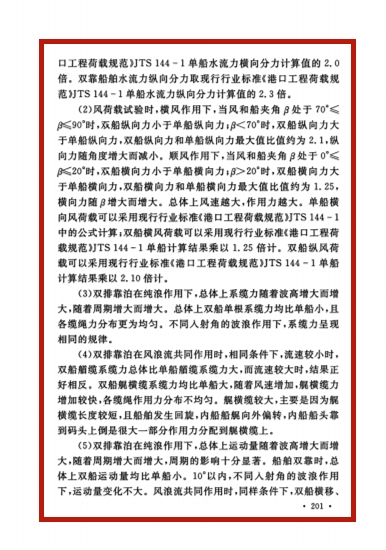 SEX8 严士常老师具体完成的“舾装码头双排靠泊试验”得到双靠船舶分别在水流、风、波浪单独作用以及风浪流共同作用等不同工况下船舶运动和受力的规律,提出风荷载、船舶作用力和系缆力的计算方法,为本标准所采用。