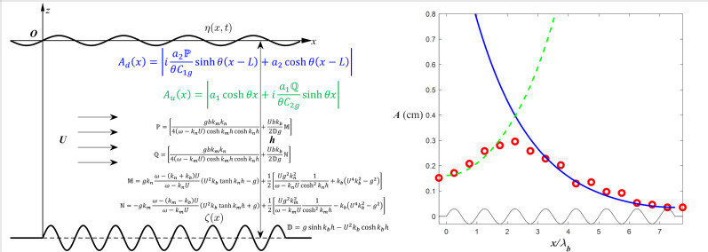 SEX8 河口海岸综合治理与保护研究团队与美国MIT研究人员合作,采用多重尺度展开的奇异摄动解析,推导出连续沙波地形上逆流行进波振幅的空间分布理论解(图1);设计并开展348组波流水槽试验,发现在相对水深0.5~1.0和弗罗德数0.20~0.34的范围内,亚临界水流经过连续沙波地形时会激发逆流行进波;总结出逆流行进波的波幅、波数与频率等波要素随水流与地形条件的变化规律与空间分布,表明波幅随流速增大呈现单峰分布并体现出明显共振特征(图2-左),在正弦地形上部波幅以指数形式增长(图2-右);理论解析与水槽试验观测相结合,阐明了逆流行进波的波形产生与成长机制是基于沙波和波相位逆流传播的两个波组成的三波共振组合与地形上部水流流速接近共振波的极限流速条件的联合作用(图3)。