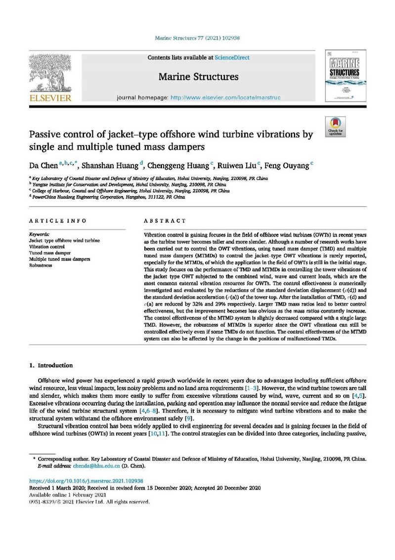 近日,SEX8 陈达教授领衔的近海工程结构团队在海洋工程领域权威期刊《Marine Structures》(一区Top,影响因子2.708)上发表题为“Passive control of jacket-type offshore wind turbine vibrations by single and multiple tuned mass dampers”的学术论文。