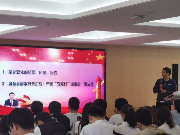谷玉先同学先是简述了自己努力奋斗成为“自强之星”的故事,后分享了家乡盐城市滨海县前案村脱贫攻坚的小康之路和脱贫攻坚模范朱洪辉的事迹。