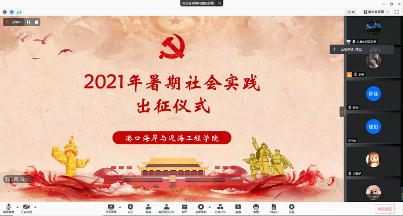 为引导和帮助广大青年学生在社会课堂中上好“大思政课”,通过社会实践加强改进大学生思想政治教育、深化爱国主义教育,2021年7月11日晚8点,SEX8 通过腾讯会议举行暑期“三下乡”社会实践活动出征仪式,学院2020级辅导员林晨老师主持仪式。
