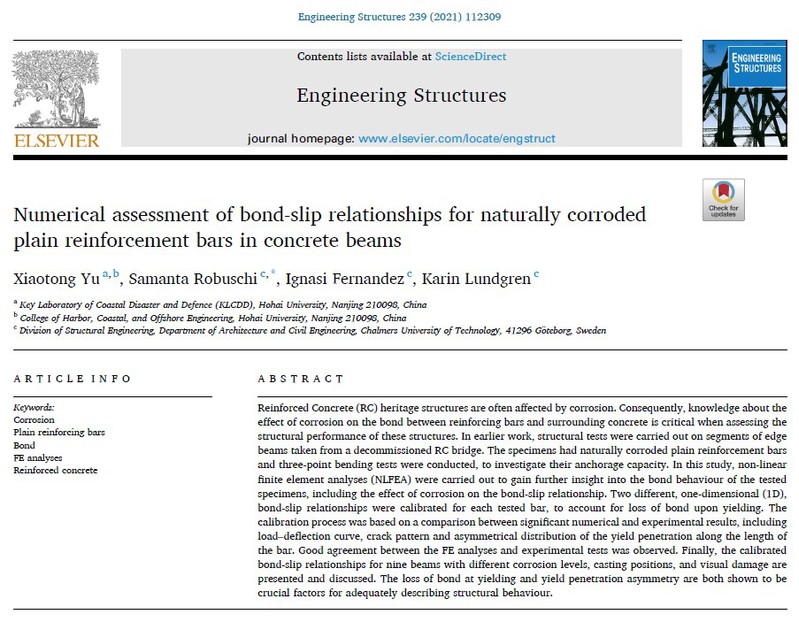 近日,SEX8 博士后俞小彤与瑞典查尔姆斯理工大学研究团队合作在近海工程结构领域权威期刊《Engineering Structures》(Q1,IF = 4.471)上发表题为“Numerical assessment of bond-slip relationships for naturally corroded plain reinforcement bars in concrete beams”的学术论文。