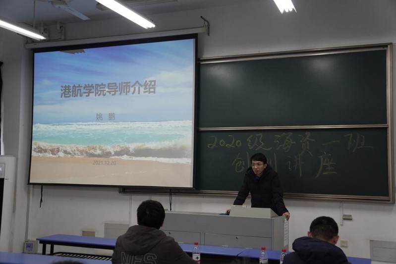 紧接着,姚鹏老师立足于我校的海资专业特色,在空间资源、可再生能源、装备三个方向为同学们讲解合适的创训思路,用通俗易懂的语言介绍了港航院各系所与海资专业有关联的老师的研究方向,帮助同学们更轻松地找到契合自己意向的创训导师。