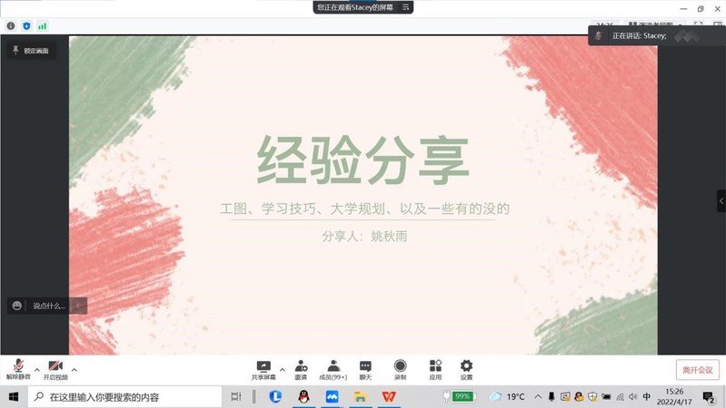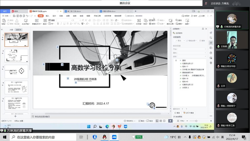 2022年4月17日,港航院同舟课堂系列讲座第四期——高数、线代、工图、大物经验分享会在线上成功举办。本次活动由港航院20级的方琳涛、史家楠、姚秋雨、蒋佩漪主讲,他们就自己对于各科特点的理解,分别从高数、线代、工图、大物向21级的学弟学妹们进行了经验分享。港航院21级辅导员王恒星老师以及港航院21级同学参与了此次分享会。